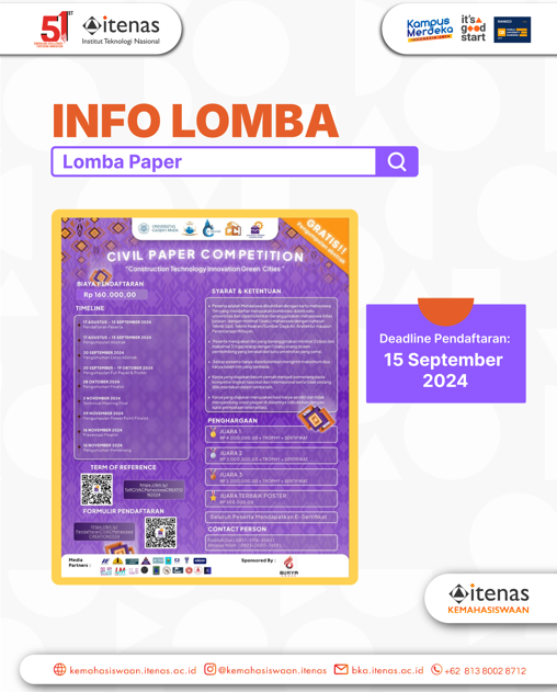 - Sub Tema Lomba : Bidang geoteknik, Bidang struktur dan perencanaan, Bidang hidro dan lingkungan.