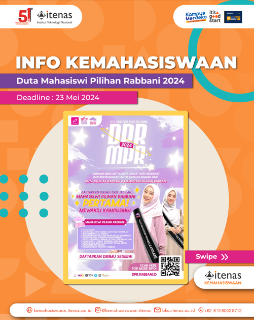 DPR “Duta Pelajar Rabbani” sebuah kompetisi pemilihan ambassador RABBANI di level sekolah tingkat SMP/SMA/SMK sederajat dan Spesial DPR 2024 akan membuka kesempatan untuk Mahasiswi Aktif join DPR 2024. Para mahasiswa dapat mengikuti MPR “Mahasiswi Pilihan Rabbani”.