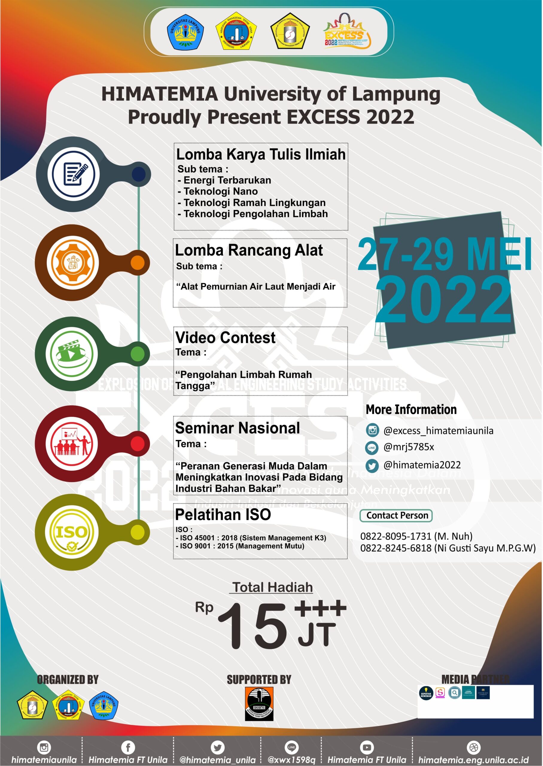 EXCESS atau Explosion of Chemical Engineering Study Activities adalah acara lomba tahunan yang diadakan oleh Mahasiswa Fakultas Teknik Kimia (HIMATEMIA) Universitas Lampung. Tema kegiatan ini pada tahun 2022 adalah “Peran Generasi Muda dalam Mendorong Inovasi Guna Menu=ingkatkan Industri Inklusif dan Berkelanjutan”. Cabang lomba yang diadakan yaitu :