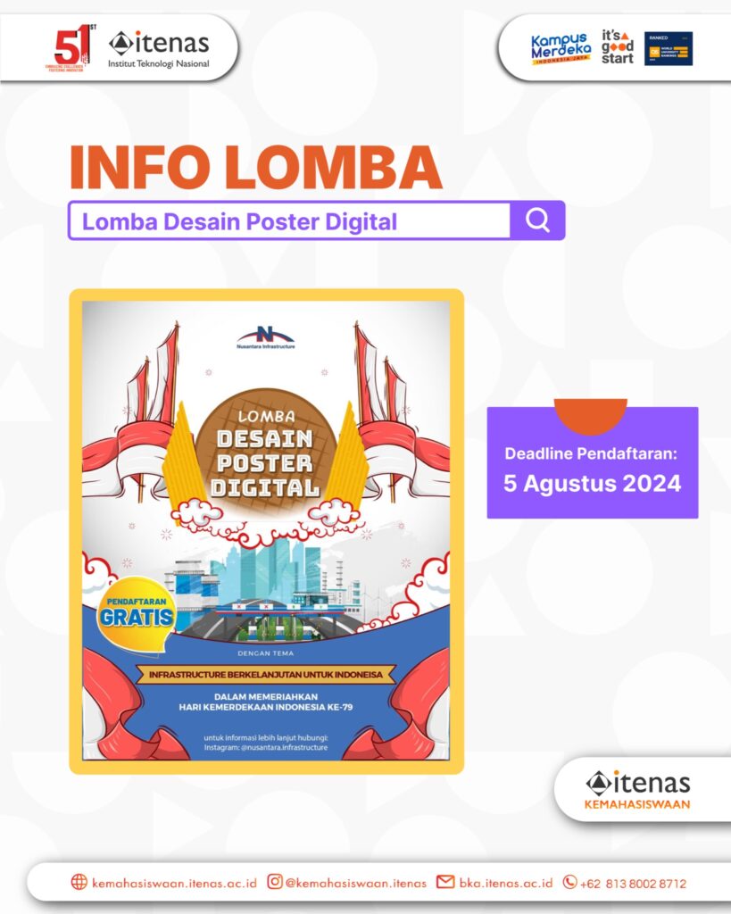 Pembangunan infrastruktur adalah salah satu pilar penting dalam memajukan Indonesia menjadi lebih baik. Pembangunan infrastruktur yang berkualitas tidak hanya untuk meningkatkan konektivitas antar daerah, tetapi juga dapat berdampak pada kesejahteraan kehidupan bermasyarakat. Maka dari itu, untuk mendukung peningkatan kesejahteraan masyarakat, dibutuhkan adanya infrastruktur berkelanjutan. Hal ini sejalan dengan tema dari lomba desain poster digital ini, yakni “Infastruktur Berkelanjutan untuk Indonesia” dengan campaign #NusantaraInfrastructureUntukMasaDepan.