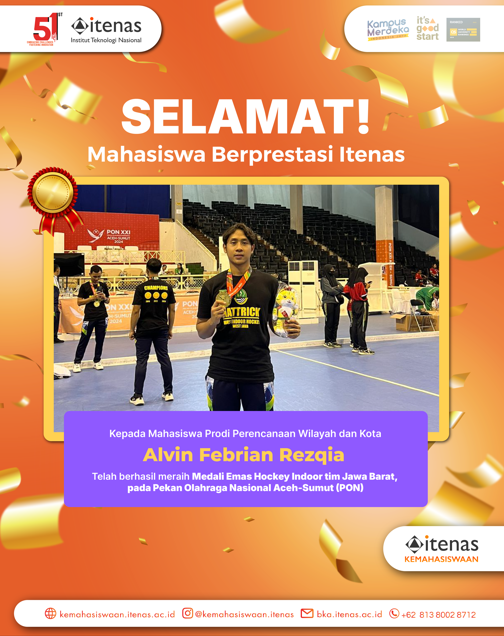 Alvin Febrian Rezqia (24-2023-007) mahasiswa program studi Perencanaan Wilayah dan Kota Itenas Bandung menjadi salah satu peserta dalam Kejuaraan Pekan Olahraga Nasional Aceh-Sumut (PON) 2024 meraih Medali Emas Hockey Indoor.