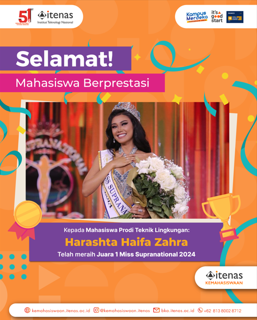 Mahasiswa Teknik Lingkungan Harashta Haifa Zahra (252020059) berhasil meraih gelar Miss Supranational 2024.