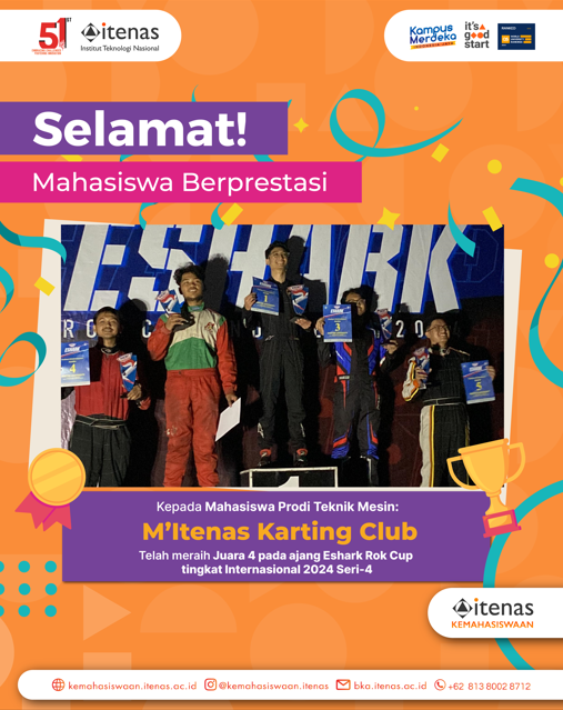 Mahasiswa Teknik Mesin Itenas berhasil meraih Juara 4 dalam ajang Eshark Rok Cup tingkat Internasional 2024 yang dilaksanakan pada Tanggal 13-16 Juni 2024. Mahasiswa tersebut, adalah :