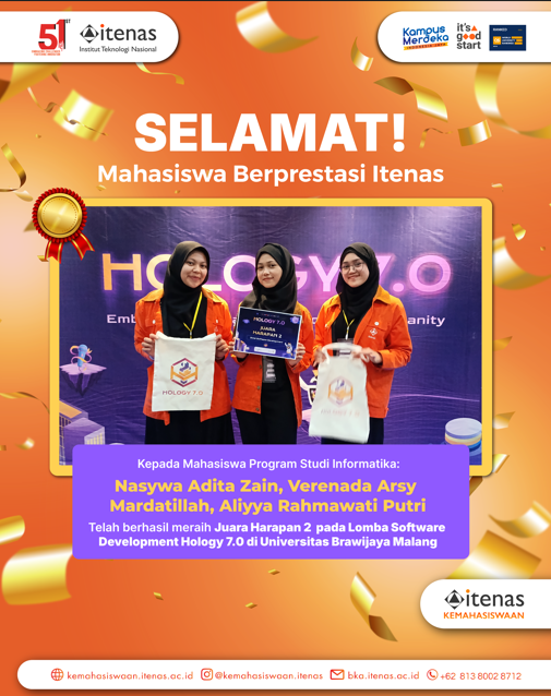 Mahasiswi Program Studi Informatika telah berhasil meraih juara Harapan 2 pada Lomba Software Devlopment Hology 7.0 yang dilaksanakan di Fakultas Ilmu Komputer Universitas Brawijaya yang diumumkan pada tanggal 3 November 2024. Mahasiswi tersebut adalah: