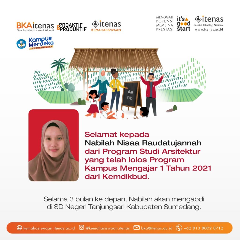 Bersama ini kami sampaikan Mahasiswa Institut Teknologi Nasional Bandung yang lolos Program Kampus Mengajar 1 Tahun 2021 dari Kemdikbud sebagai berikut: