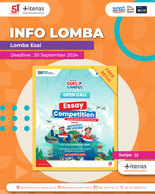 Pertamina Goes to Campus (PGTC) menghadirkan “Essay Competitions” dalam rangkaian PGTC bertemakan sustainability yang terbuka bagi mahasiswa di seluruh Indonesia dengan total hadiah puluhan juta rupiah!