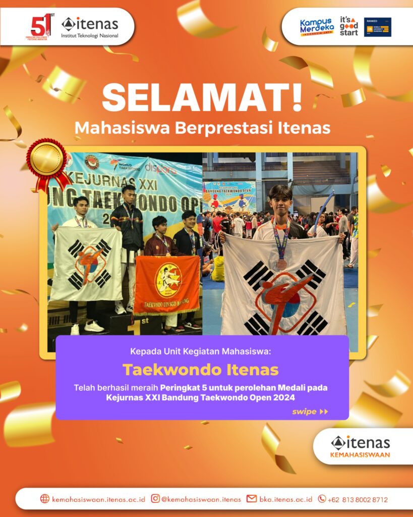 Naufal Akbar Fachrizal (16-2023-002) mahasiswa program studi Sistem Informasi Itenas Bandung meraih medali perak dan Hikam Hikmatul Huda (15-2023-187) mahasiswa program studi Teknik Infomatika Itenas Bandung meraih medali perunggu pada Kejuaraan Nasional Bandung Taekwondo Open tahun 2024.